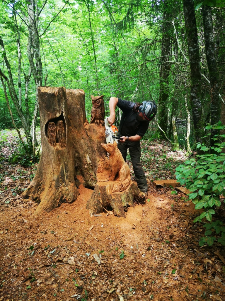 - Trolls et animaux fantastiques de la forêt. Avec sa tronçonneuse, il fait revivre les arbres. Sculpture à la tronçonneuse, par Pascal Trunkenwald. Osmose Créations Bois.
